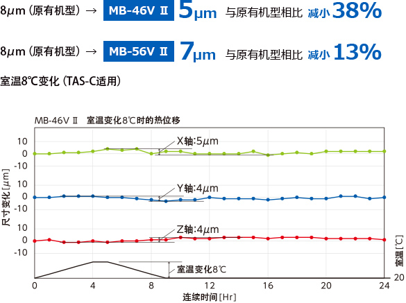 Thermo-Friendly Concept在MB-V Ⅱ系列中得到新的進(jìn)化,并提高了尺寸穩(wěn)定性。機(jī)床結(jié)構(gòu)設(shè)計得到進(jìn)一步的發(fā)展,在一般工廠環(huán)境下,MB-46V Ⅱ的經(jīng)時加工尺寸變化從8μm(原有機(jī)型)改善到5μm,提高了38%(與原有機(jī)型相比),從而實(shí)現(xiàn)比以往更加穩(wěn)定的高精度。由于無需恒溫室來保持室溫恒定,因此可降低工廠設(shè)備成本和功耗。